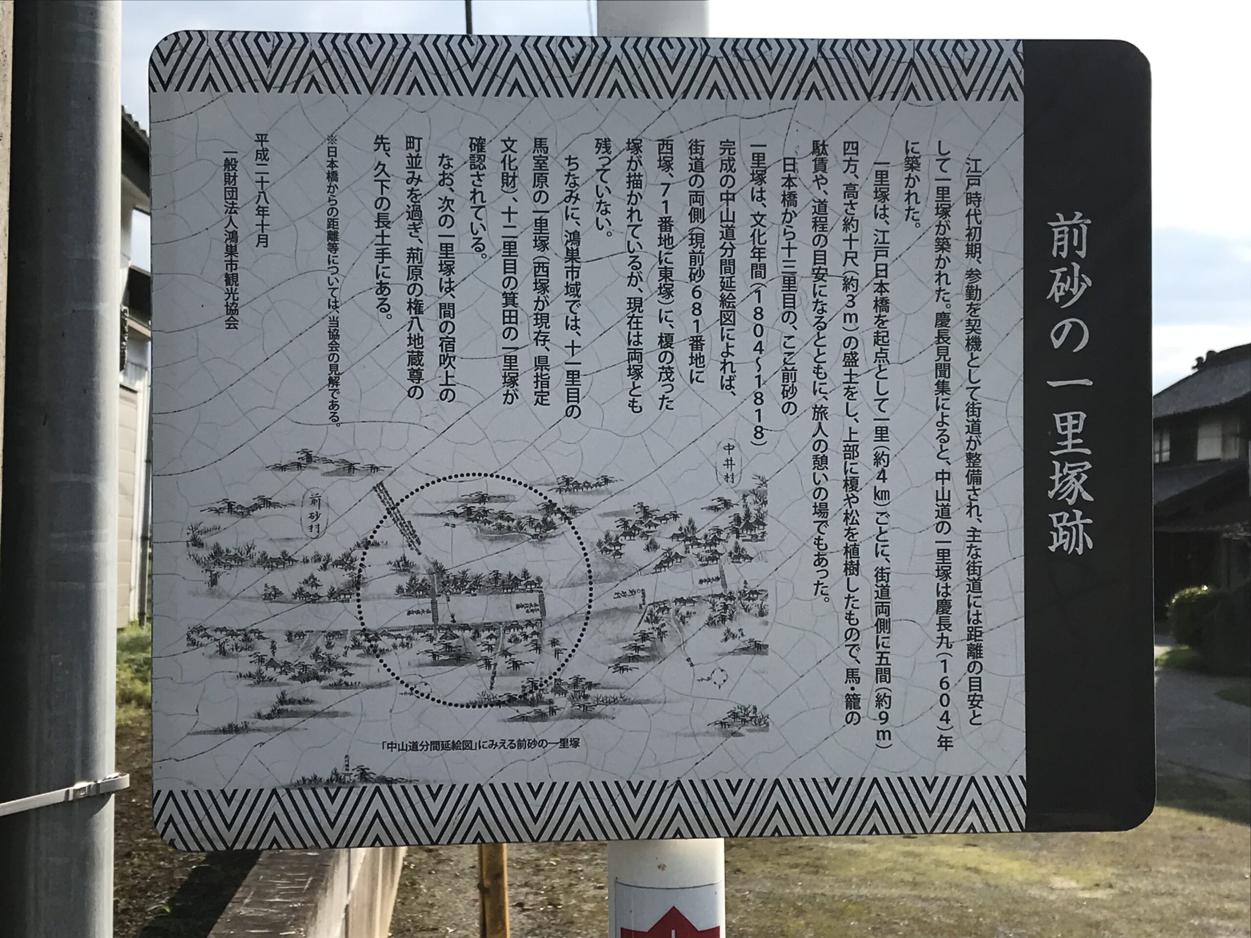 一里塚は、江戸日本橋を起点として一里(約4㎞)ごとに、街道両側に五間(約9m)四方、高さ約十尺(約3m)の盛土をし、上部に榎や松を植樹したもので、馬・籠の駄賃や、道程の目安になるとともに、旅人の憩いの場でもあった。日本橋から十三里のここ前砂の一里塚は、文化年間(1804年~1818年)完成の中山道分間延絵図によれば、街道の両側(現前砂681番地に西塚、71番地に東塚)に榎の茂った塚が描かれているが、現在は両塚とも残っていない。