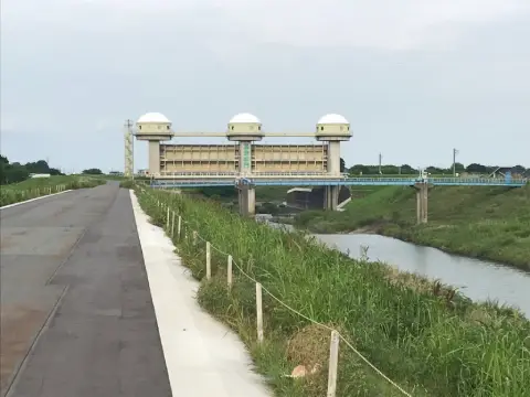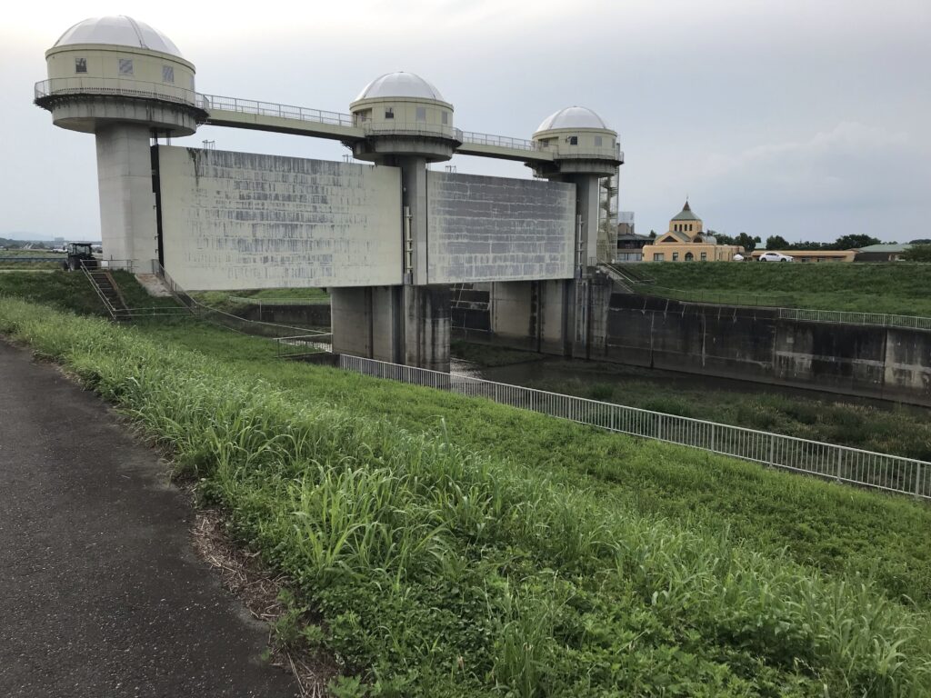 荒川の堤防沿いも含め、この和田吉野川の堤防沿いもよいサイクリングロードになっており、水門の脇を橋がかかっています。